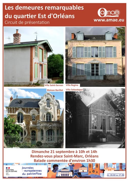 Pour les Journées du Patrimoine 2025, AMAE (Association pour la Mémoire et l’Animation de l’Est d’Orléans), amie de notre groupe, vous propose de découvrir quatre demeures remarquables.