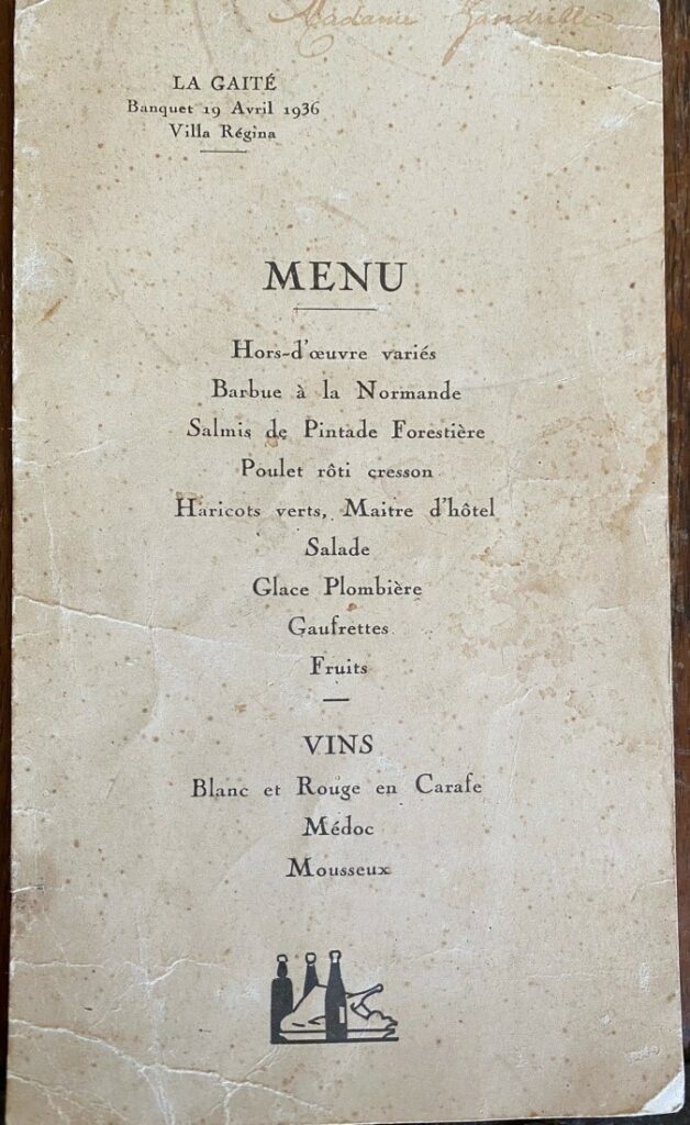 - Le 9 novembre 1930, l’Amicale des Anciens militaires de la Gendarmerie et de la Garde Républicaine y tient banquet après son assemblée générale. A ces 150 convives se joignirent les Anciens Sous-Officiers qui, après une matinée dansante à l’Institut animée par l’orchestre Bordereau, firent banquet à la Villa Régina.