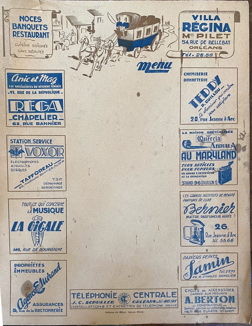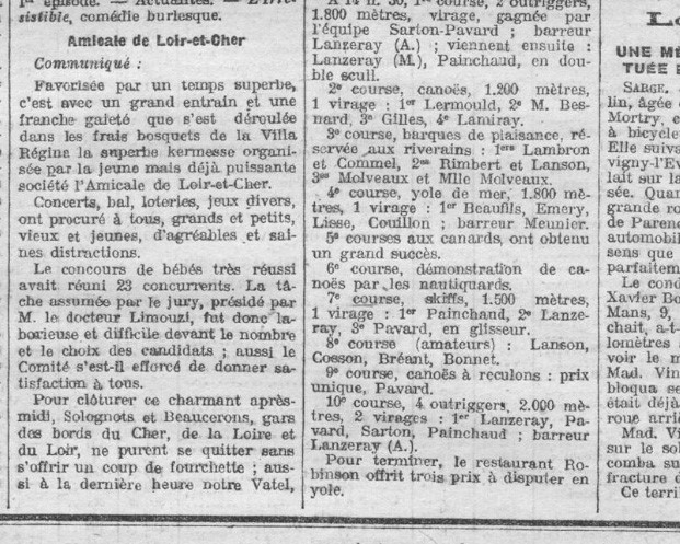 - Le 12 août 1926, l’amicale de Loir-et-Cher tient sa kermesse dans les frais bosquets de la Villa Régina. Concerts, bal, loteries, jeux divers. Le concours de bébés, présidé par le Docteur Limouzi, a réuni 23 concurrents. Puis vint le temps du dîner concocté par Maître Pilet (Journal du Loiret du 12/08/1926) – consulté le 27/11/2017