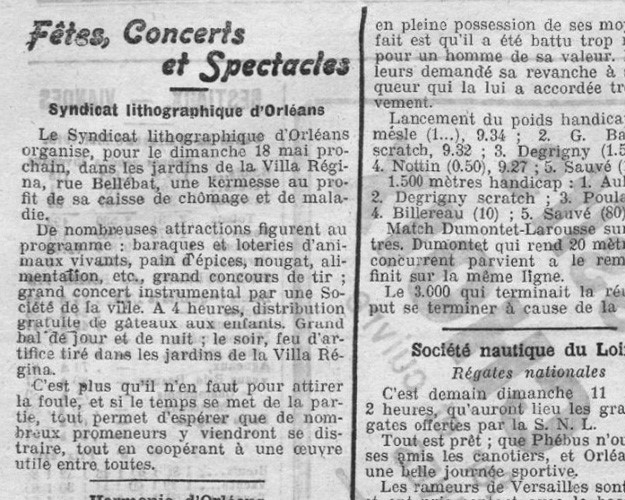 - Le 18 mai 1913, le Syndicat Lithographique d’Orléans organise une kermesse dans les jardins de la Villa au profit de sa caisse de chômage et de maladie. De nombreuses animations sont au programme : baraques et loteries d’animaux vivants, pain d’épices, nougat, alimentation, grand concours de tir, concert instrumental, distribution gratuite de gâteaux, bal de jour et de nuit, feu d’artifice (Journal du Loiret du 11/05/1913) – Consulté le 27/11/2017