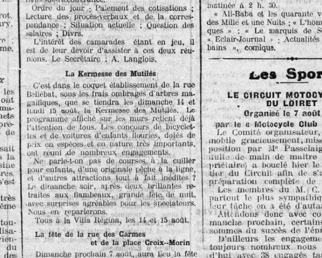 - Le 14 et 15 août 1921 la Villa Régina héberge la Kermesse des mutilés. Dans le coquet établissement de la rue de Bellébat, sous les frais ombrages d’arbres magnifiques. Concours de bicyclettes et de voitures d’enfants fleuries, courses à la cuiller, pêche à la ligne, retraite aux flambeaux, et grande fête de nuit (Journal du Loiret du 04/08/1921) – Consulté le 27/11/2017