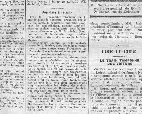 - Le 15 août 1934 se tient la grand Fête d’été du Syndicat du Livre. Concert instrumental avec la Musique de Saint-Jean-le-Blanc, concert vocal avec la participation de Chansonia et de Moriss-Pol, concours de bonnets de papier, tournoi de ping-pong. Le bénéfice a été reversé à la Caisse chômage-maladie du Syndicat du Livre (Journal du Loiret du 05/07/1934) – consulté le 27/11/2017